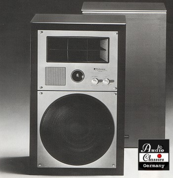 1975 ~ 1976 3 Weg Bass Reflex Frequenzgang: 30-20.000 Hz Belastbarkeit: 70 W (Sinus) 8 Ω Übergangsfrequenz: 1500/7.000 Hz Schalldruck: 95 dB/1 W Abmessung B x H x T: 400 x 660 x 317 mm Gewicht: 22,5 Kg TT: 300 mm MT: 250×100 mm Horn HT: 50 mm Horn Pegelsteller HT/MT Preis pro Paar: 1600,- DM |